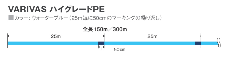 マルチマーキング(25m毎のブルーマーキング)で、アングラーの使いたい長さに巻取り可能。 カラー:ウォーターブルー+マーキング